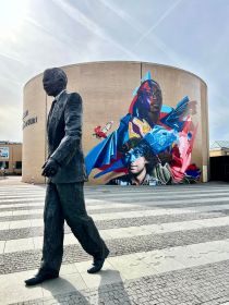 vanuit de hele wereld. Een grote muurschildering door kunstenaarsduo Karski & Beyond verbeeldt welke thema's de Haagse jongeren graag terug zien op de agenda van de VN. Het werk staat op de muur van One Planet (Museon-Omniversum), recht achter het beeld van Nelson Mandela. Jongeren uit Den Haag hebben meegedacht over wat er op de muurschildering is afgebeeld.